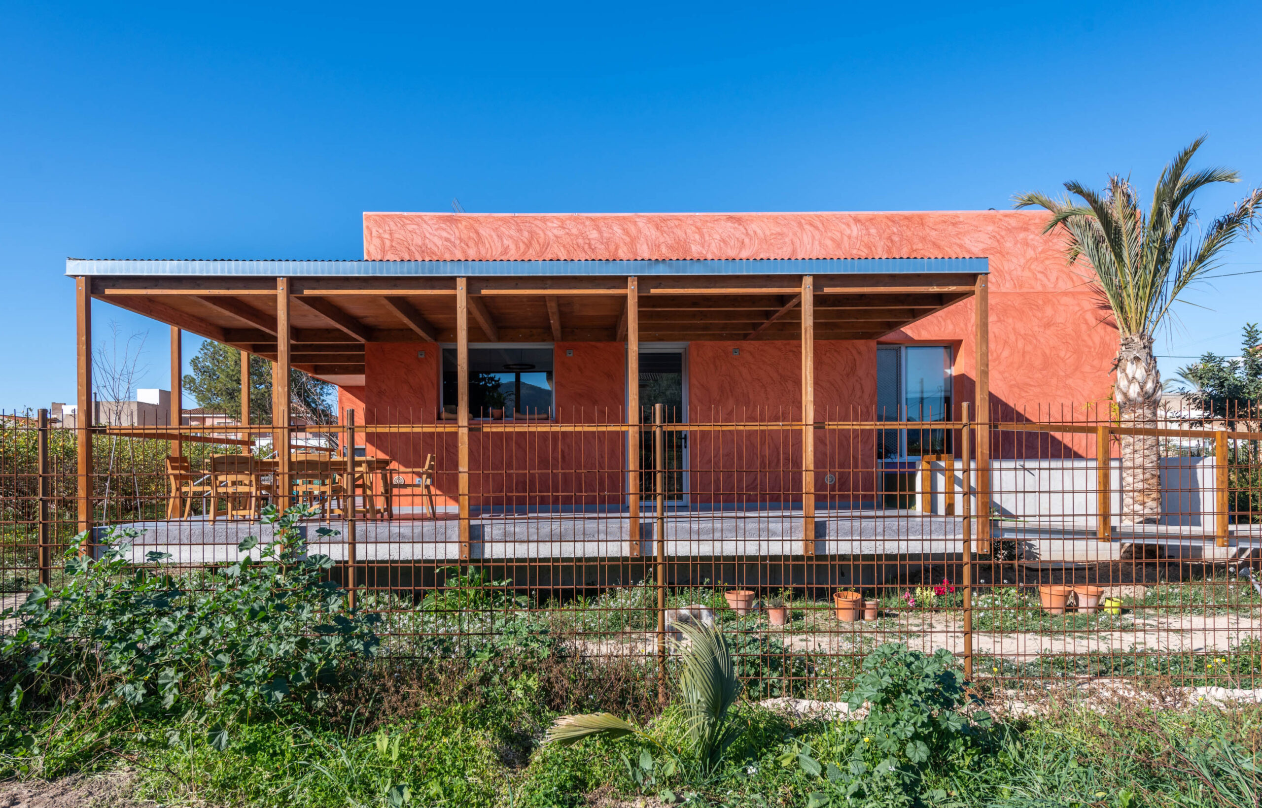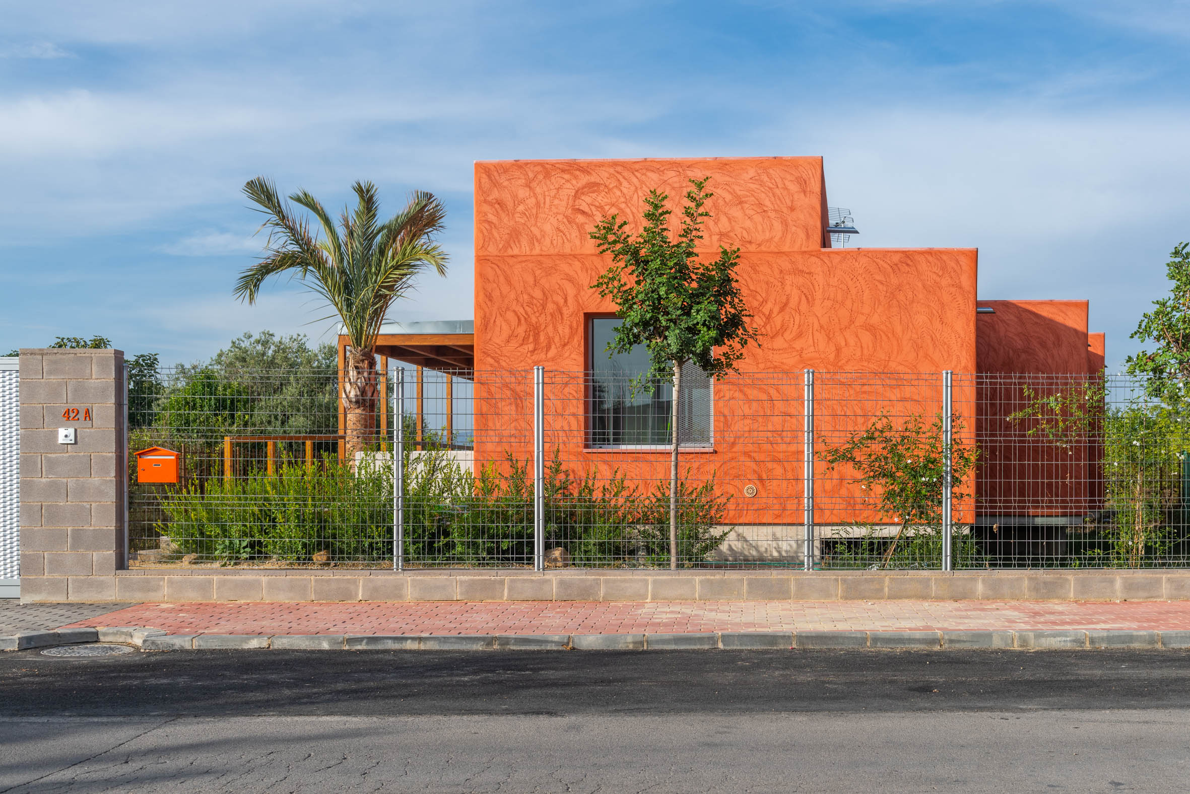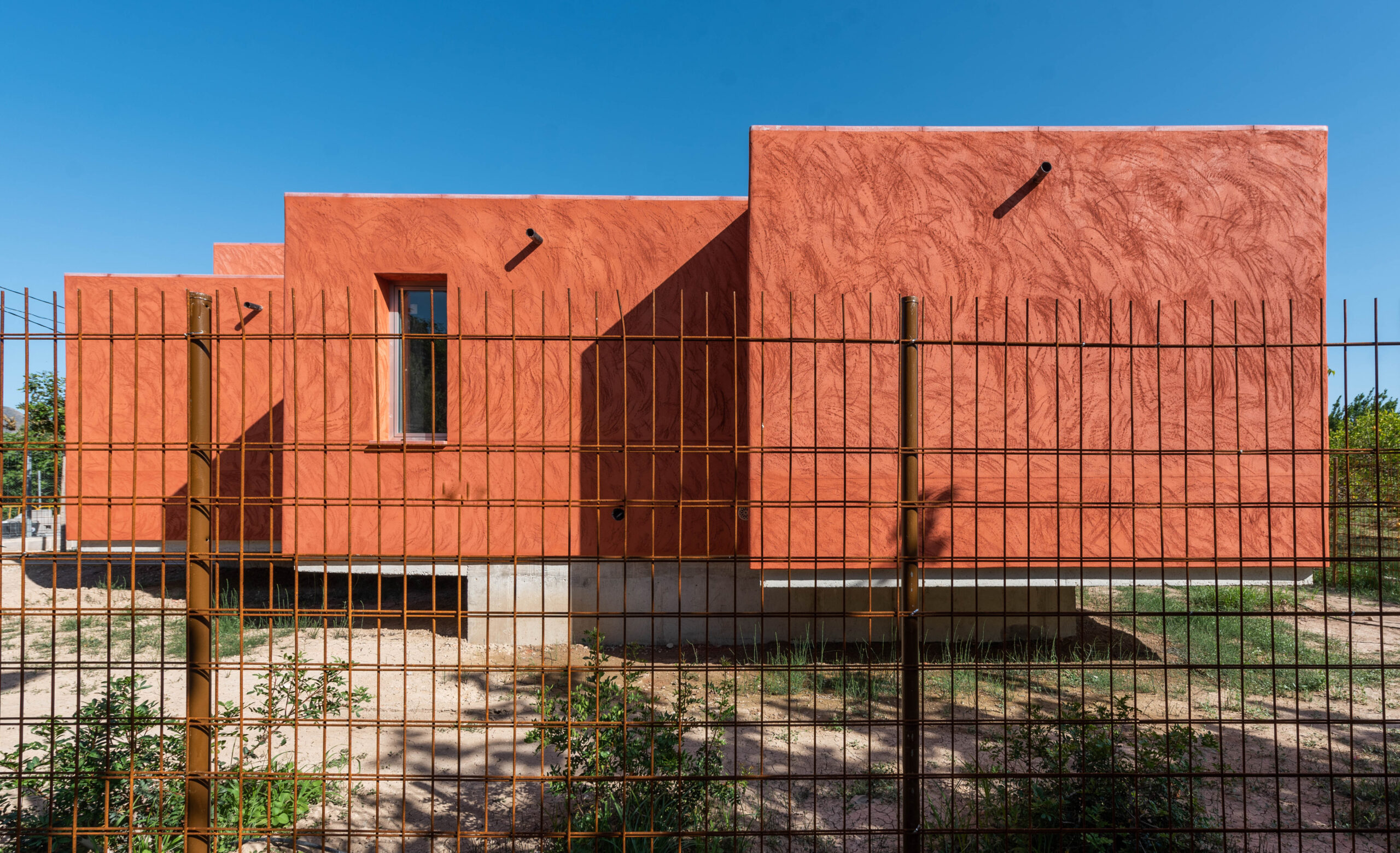 El revestimiento de mortero de cal aérea pigmentado naranja degradado y acabado raspado a contra llana con esquinas redondeadas homenajea la textura de las innumerables viviendas inacabadas que salpican la Huerta.