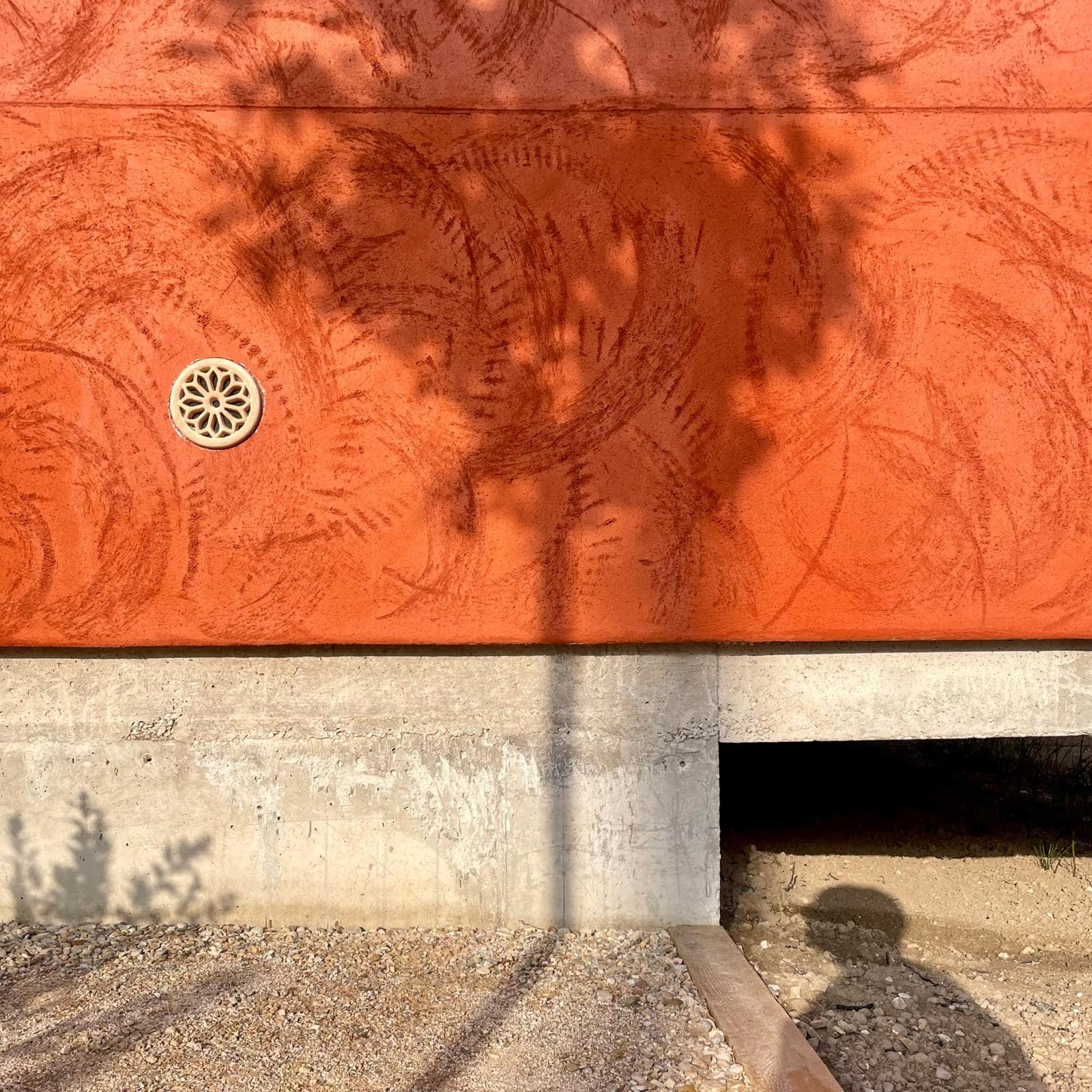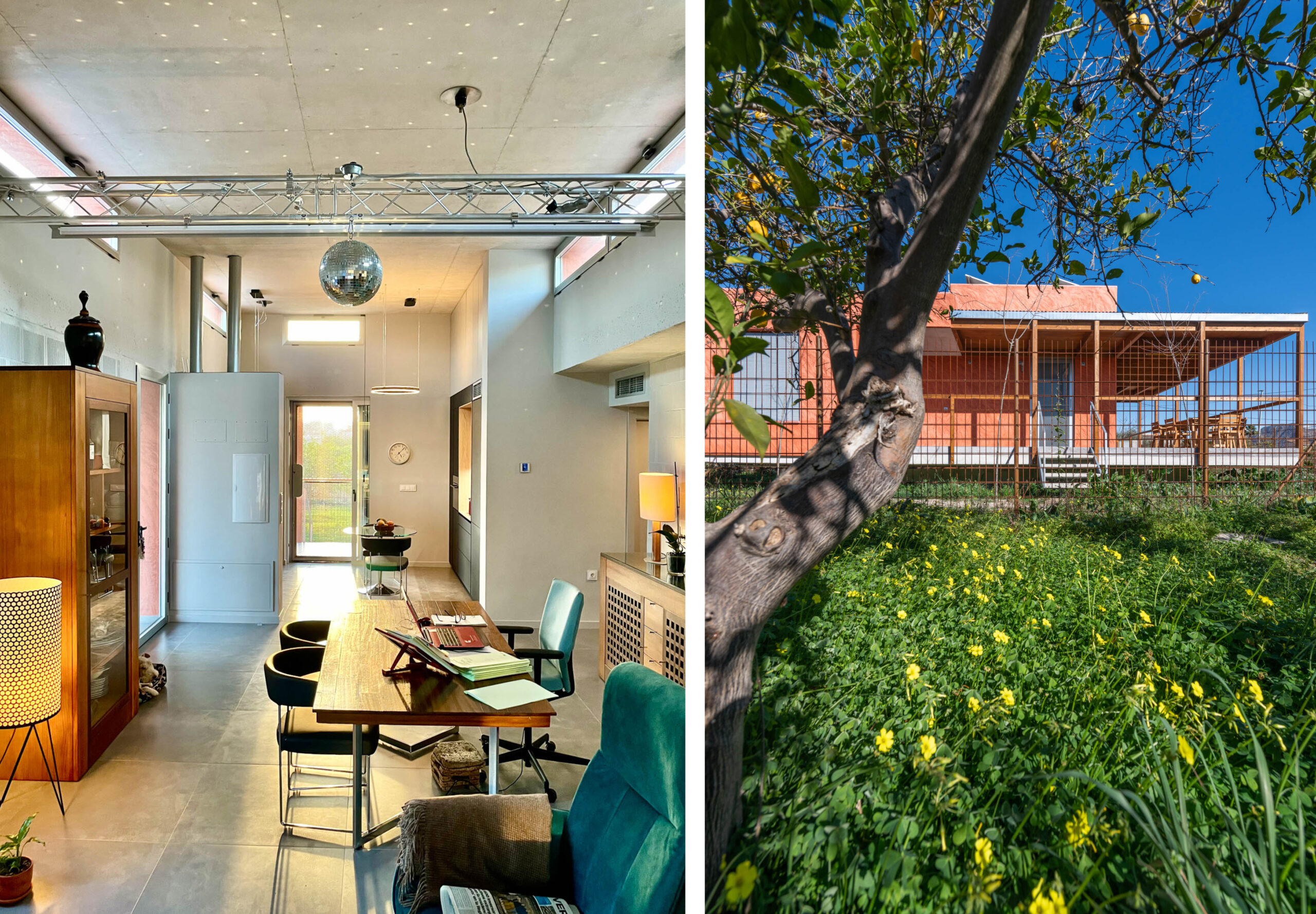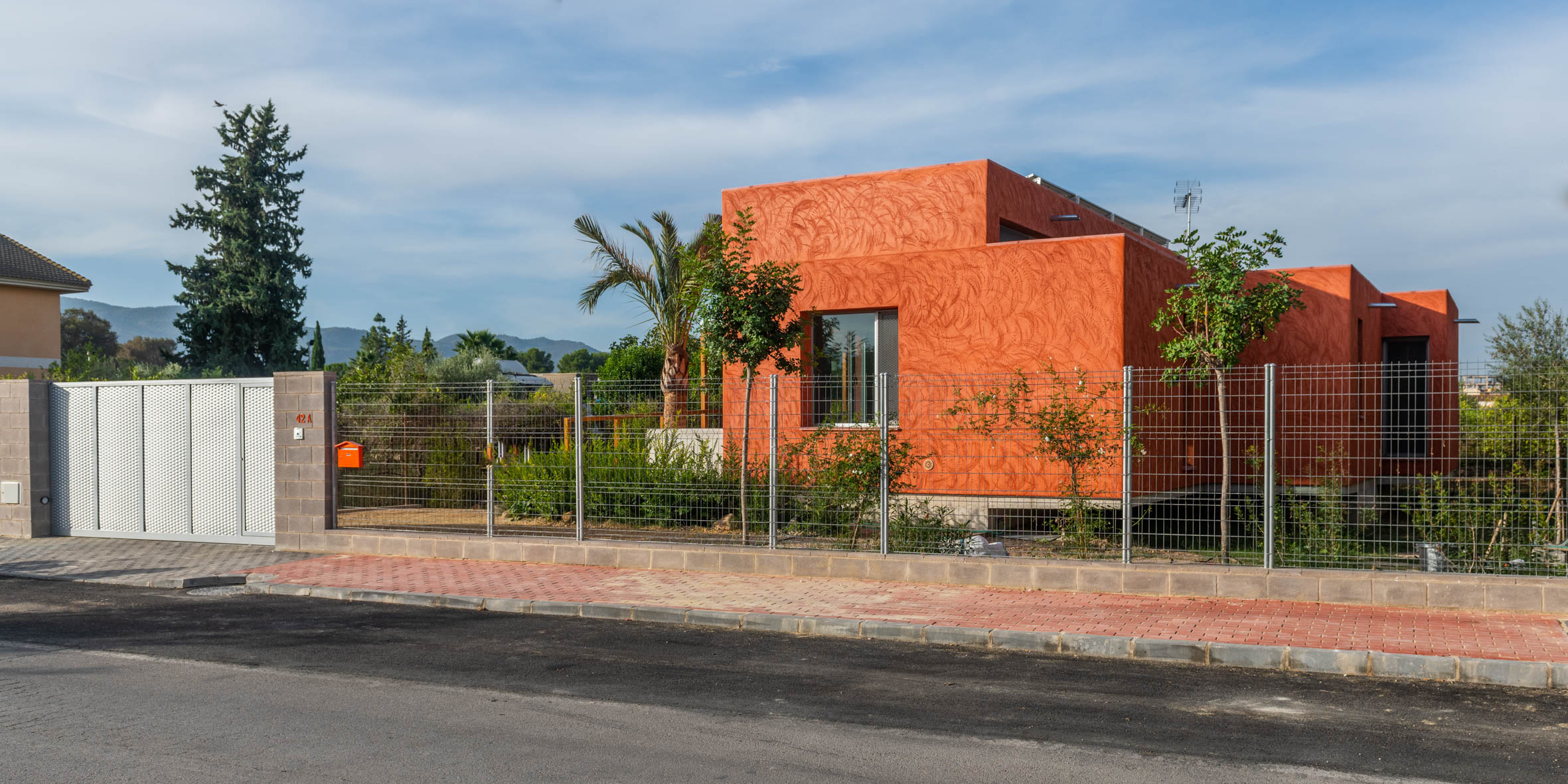El revestimiento de mortero de cal aérea pigmentado naranja degradado y acabado raspado a contra llana con esquinas redondeadas homenajea la textura de las innumerables viviendas inacabadas que salpican la Huerta.