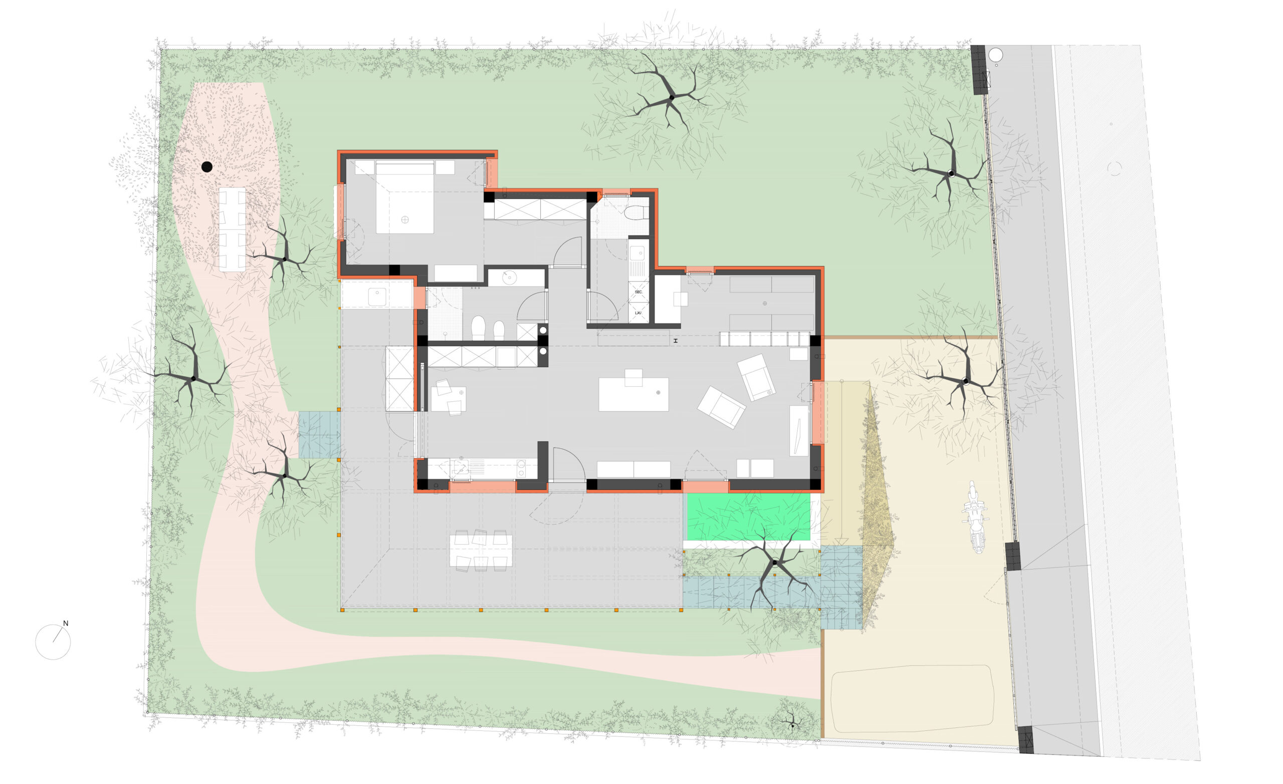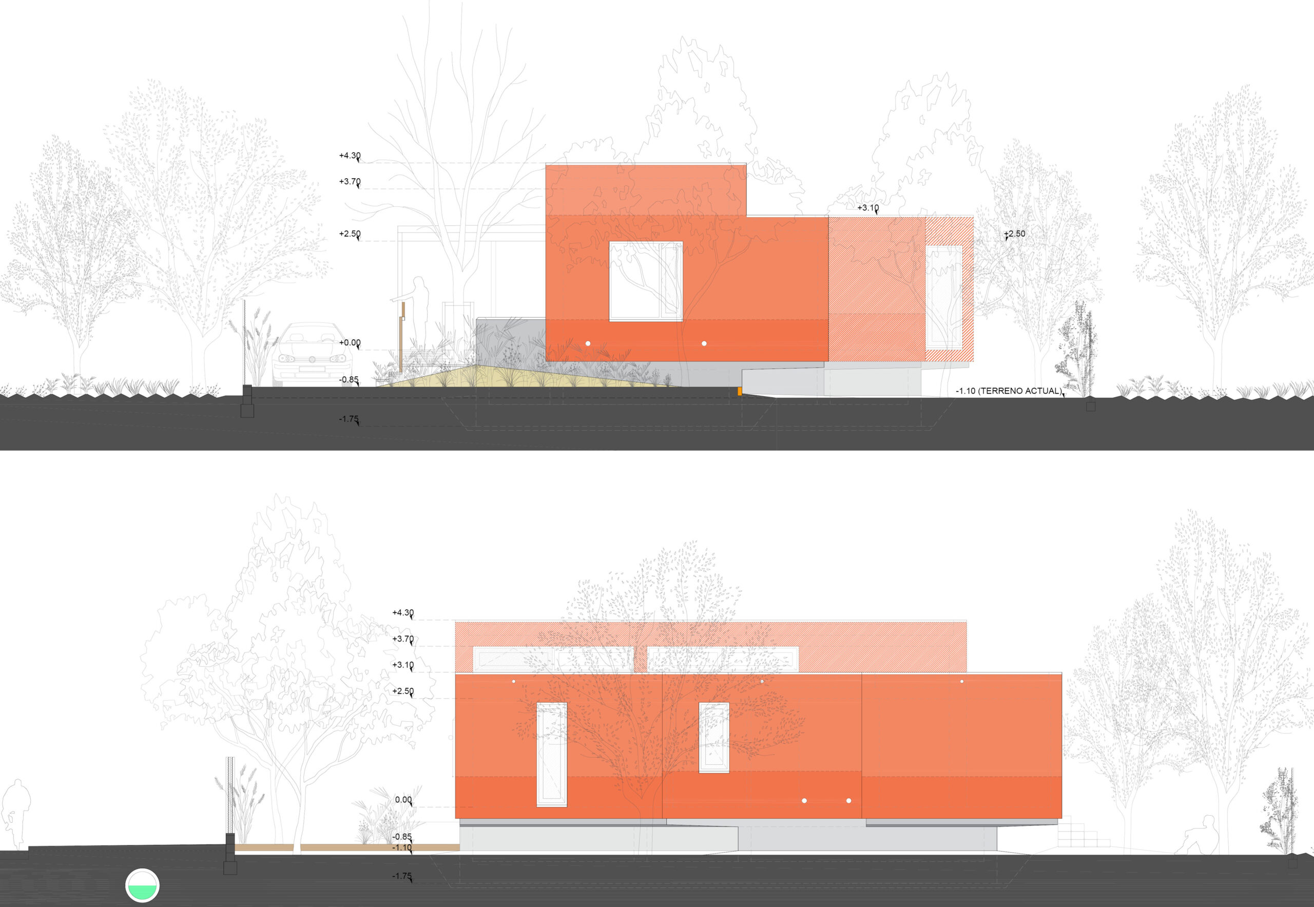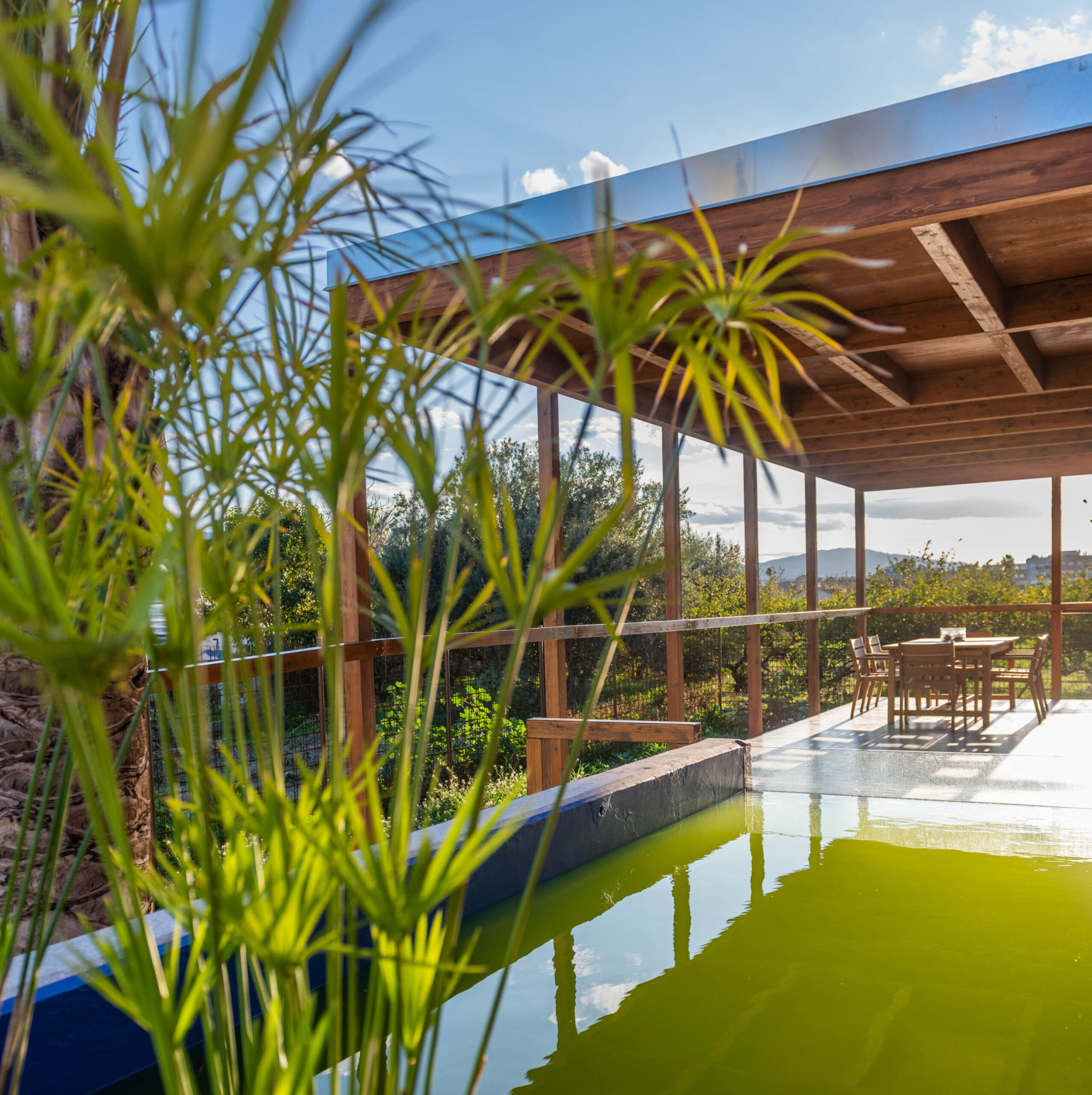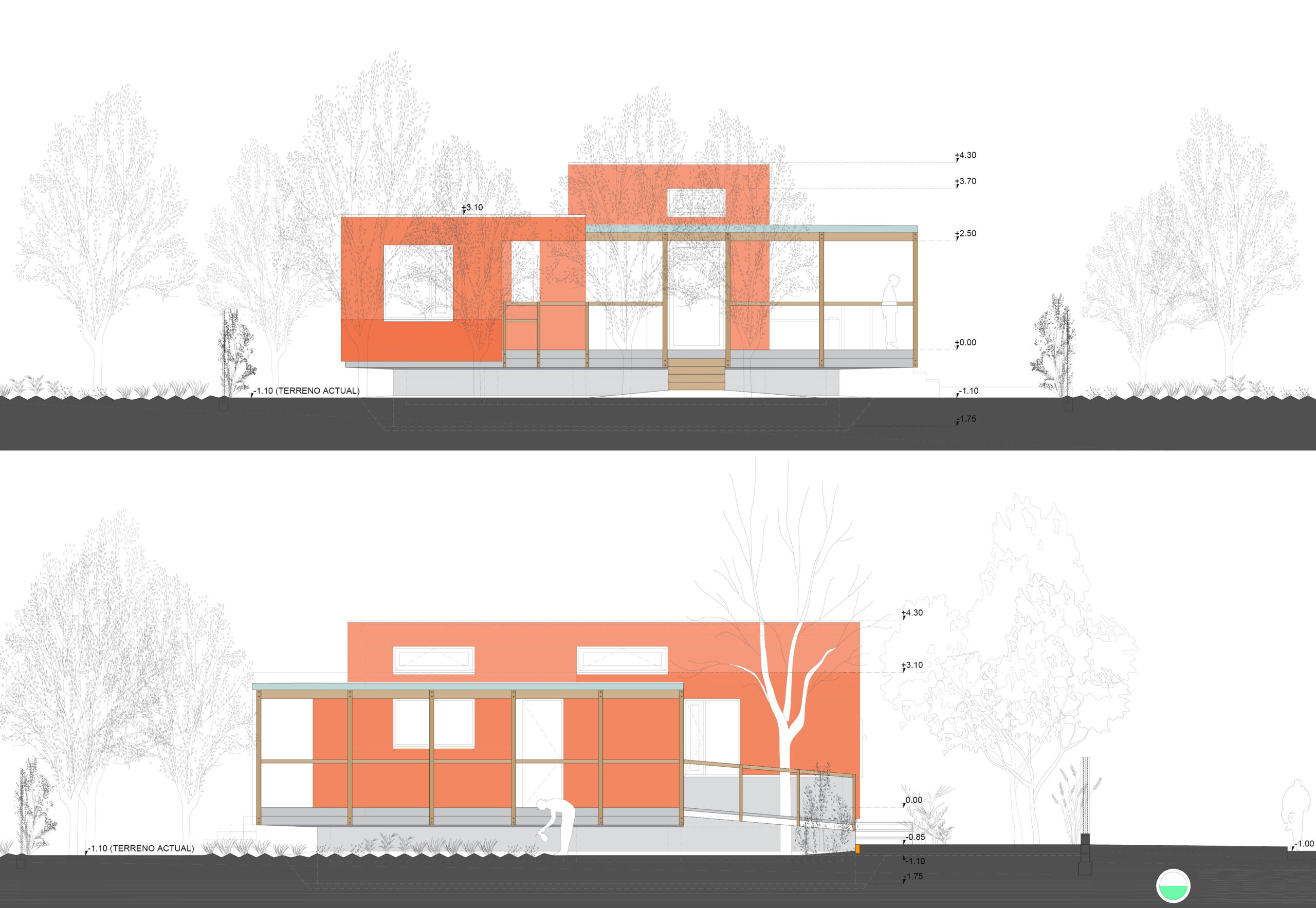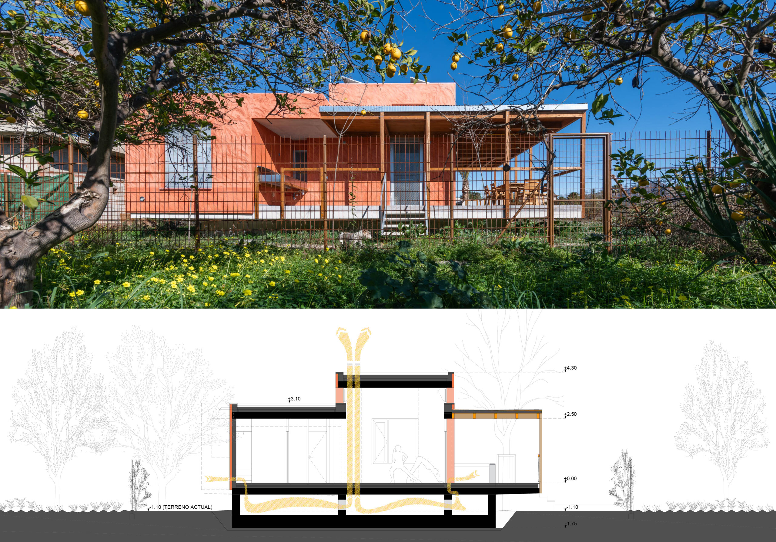 Esta vivienda unifamiliar aislada se apoya sobre una parcela de huerta cuyo nivel freático casi alcanza la superficie, tratando de liberar de su impacto el mayor suelo fértil original posible y separarse del mismo mediante una cámara ventilada con tomas de aire elevadas y extracción a cubierta que la protejan tanto de la humedad como de eventuales inundaciones.