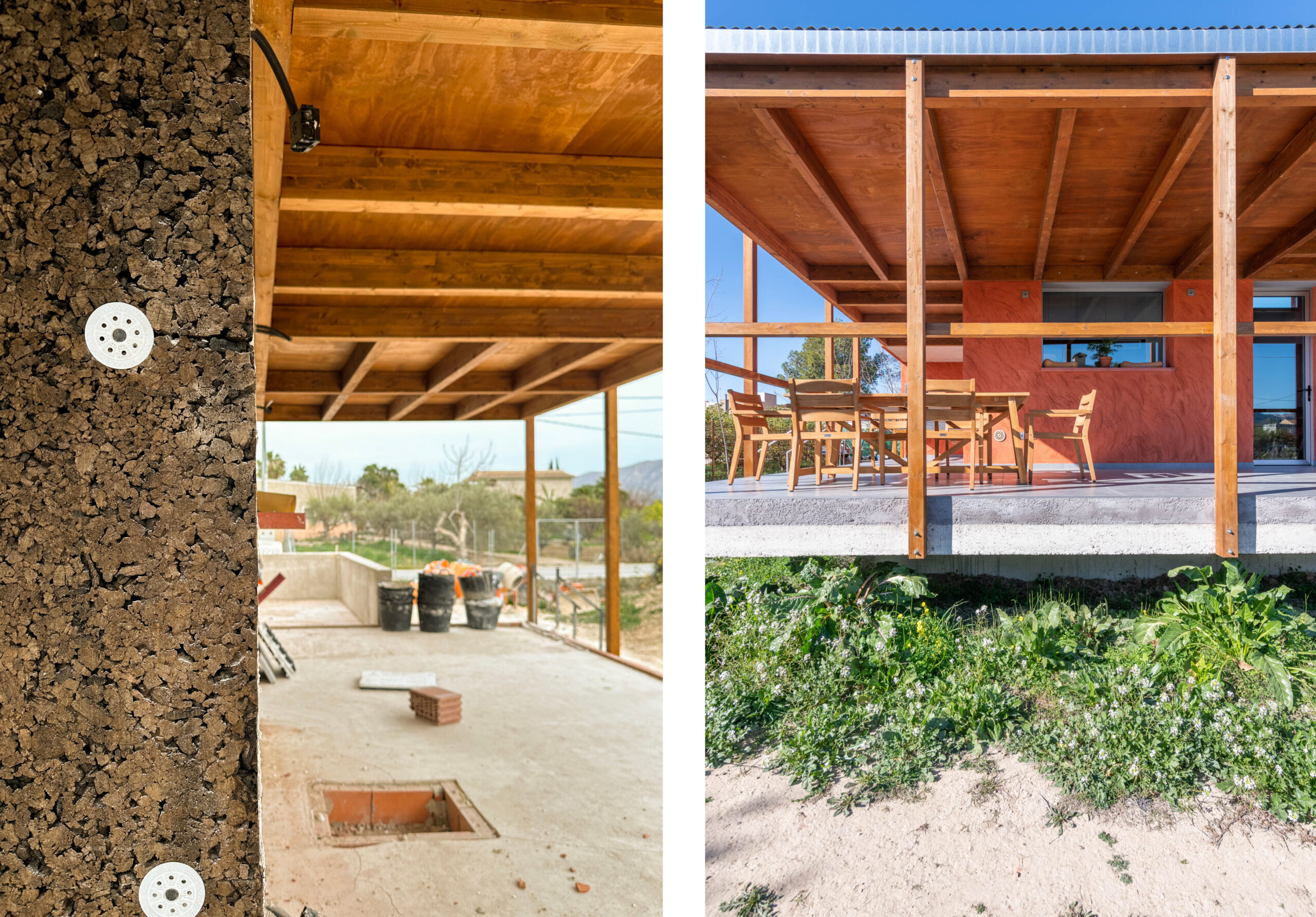 La fachada de termoarcilla vista al interior y el revestimiento de corcho natural exterior le aportan la inercia y aislamiento térmicos adecuados.