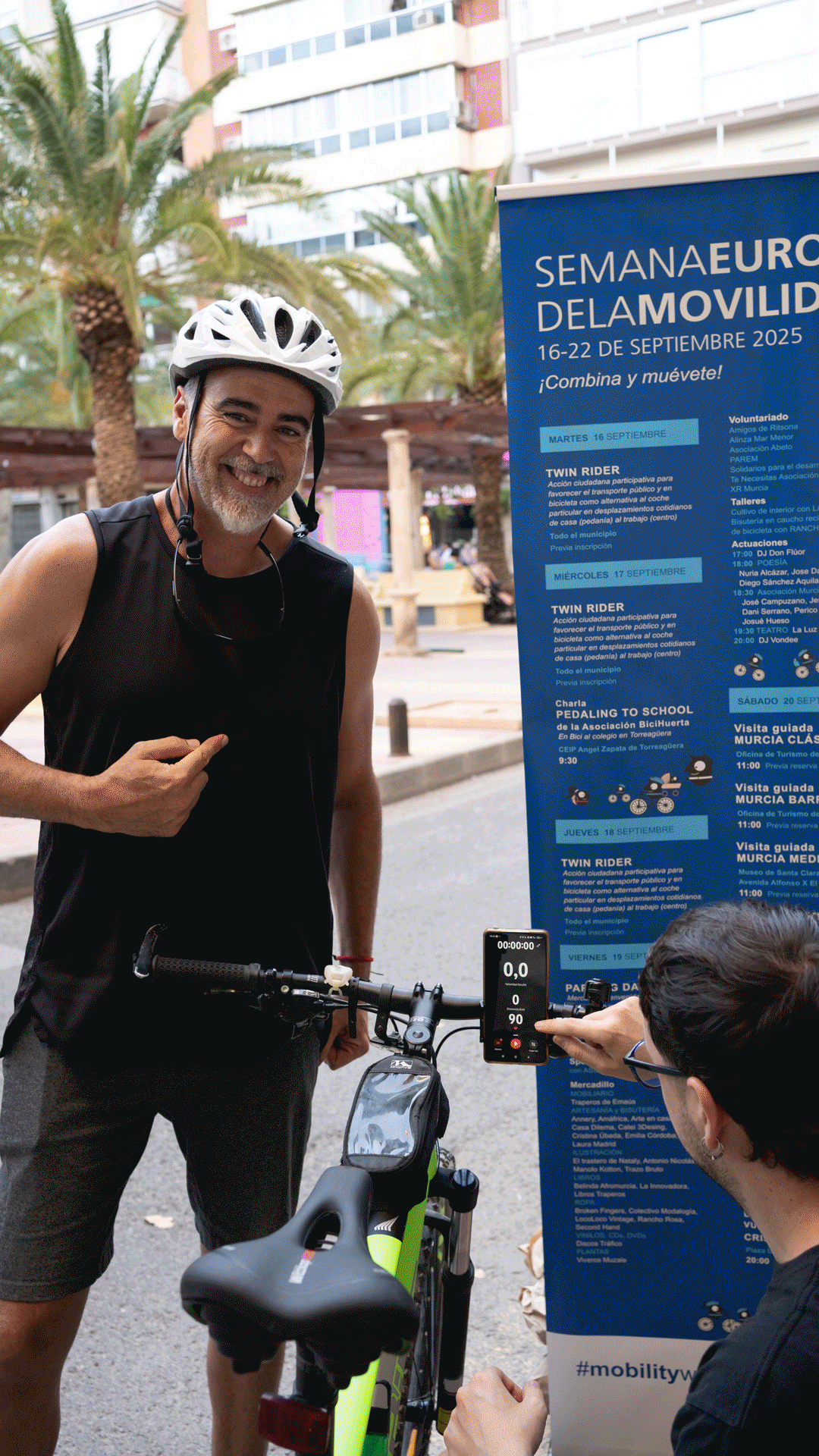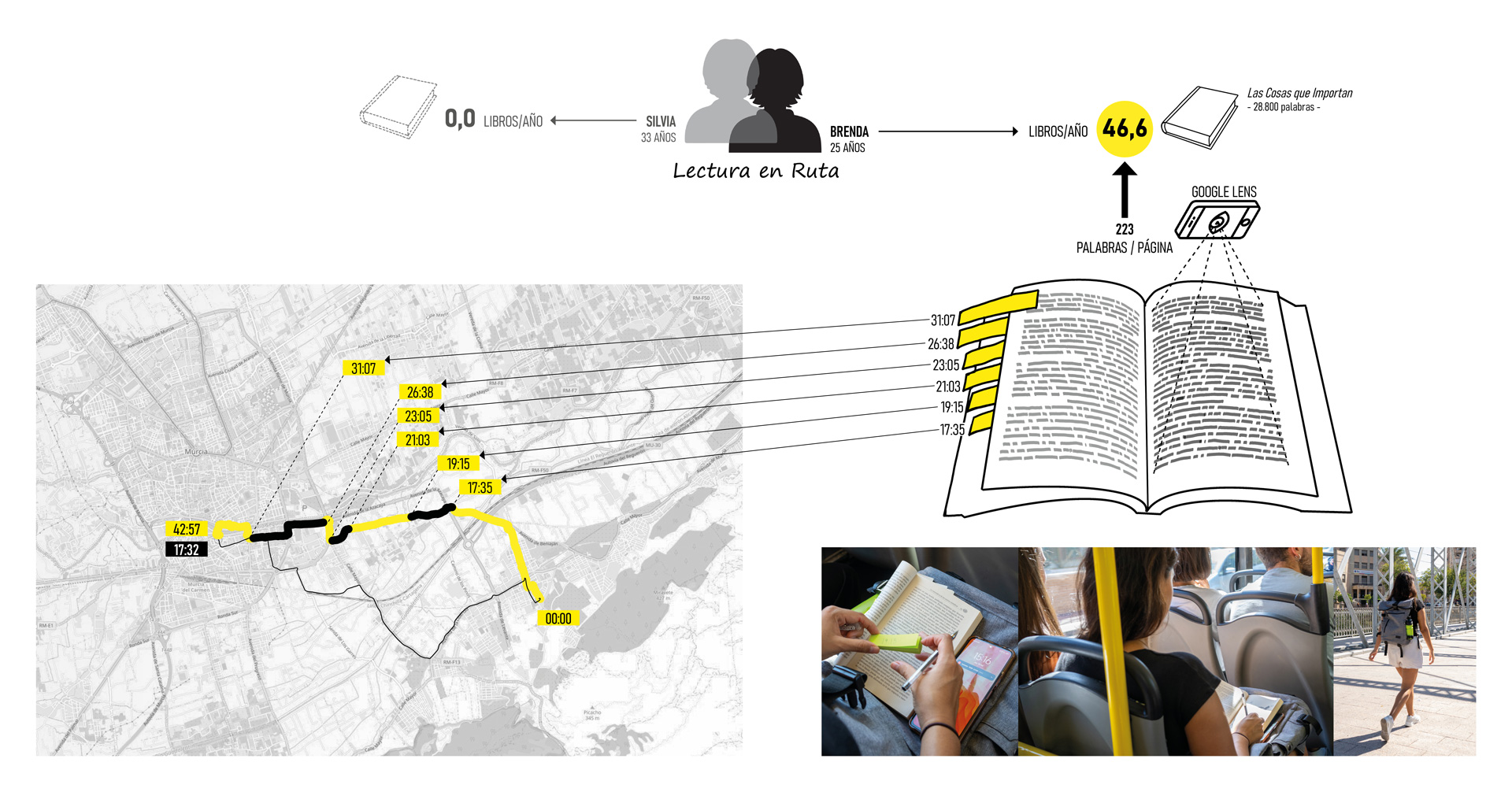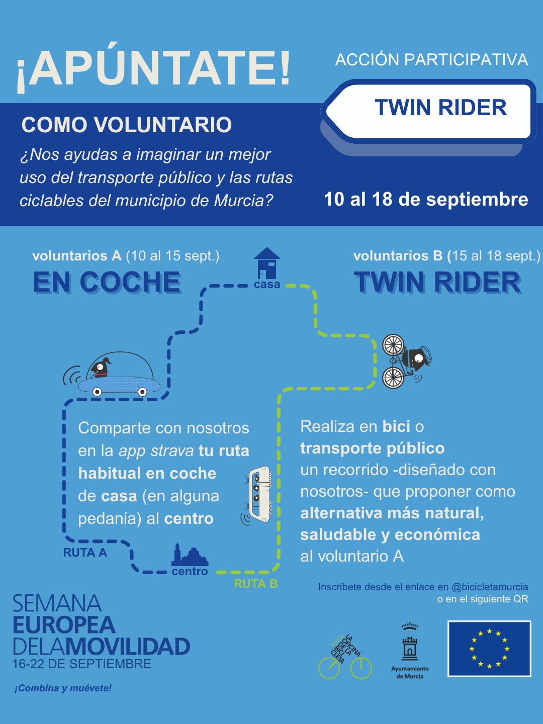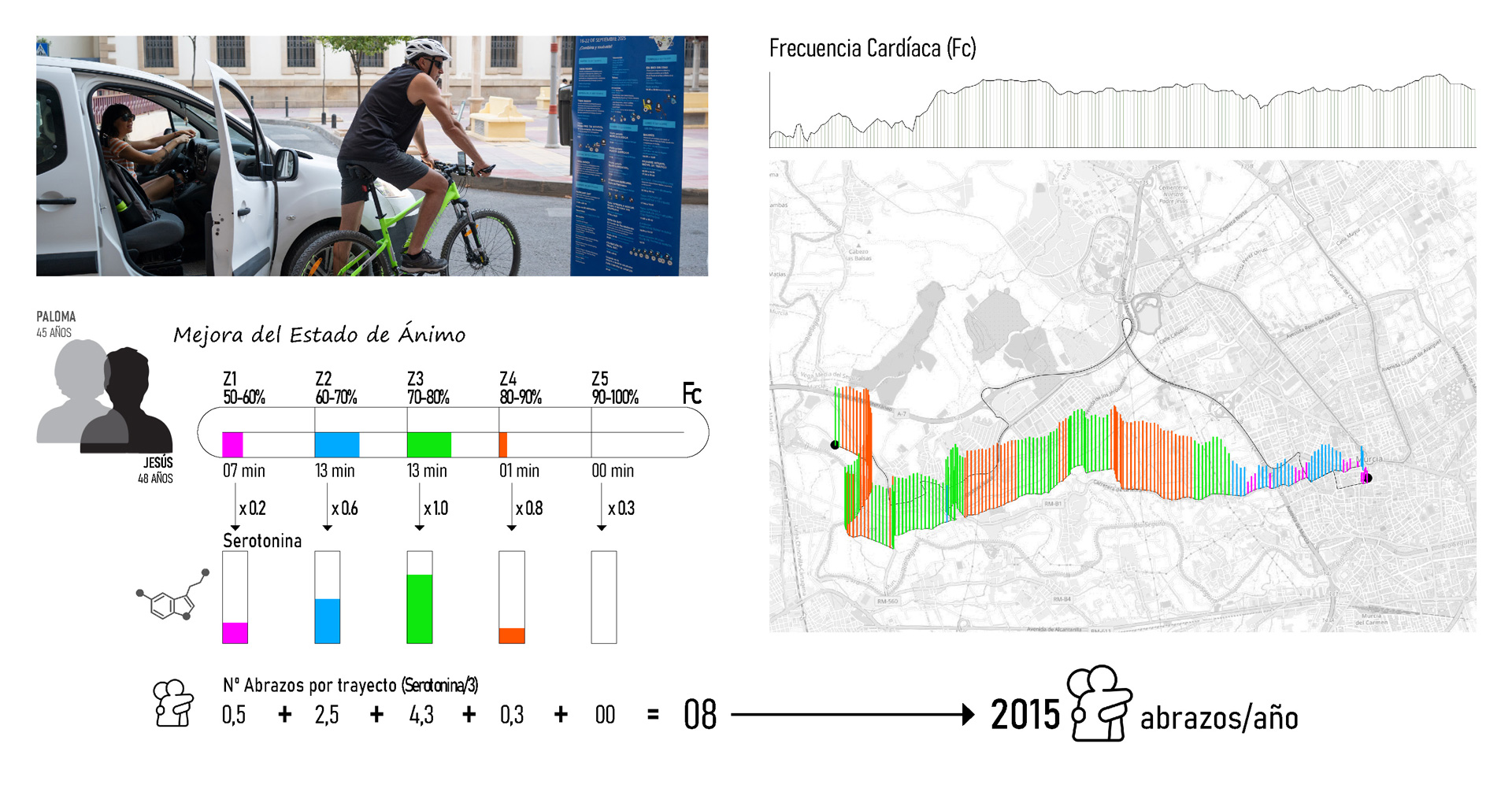 Consistió en una acción de visualización de hábitos relacionados con la movilidad en el contexto de la singularidad urbana (dicotomía centro-pedanías) del municipio de Murcia completada con una propuesta creativa y sugerente de acompañamiento hacia prácticas alternativas más ambientalmente enriquecedoras, saludables y sostenibles según la siguiente secuencia: