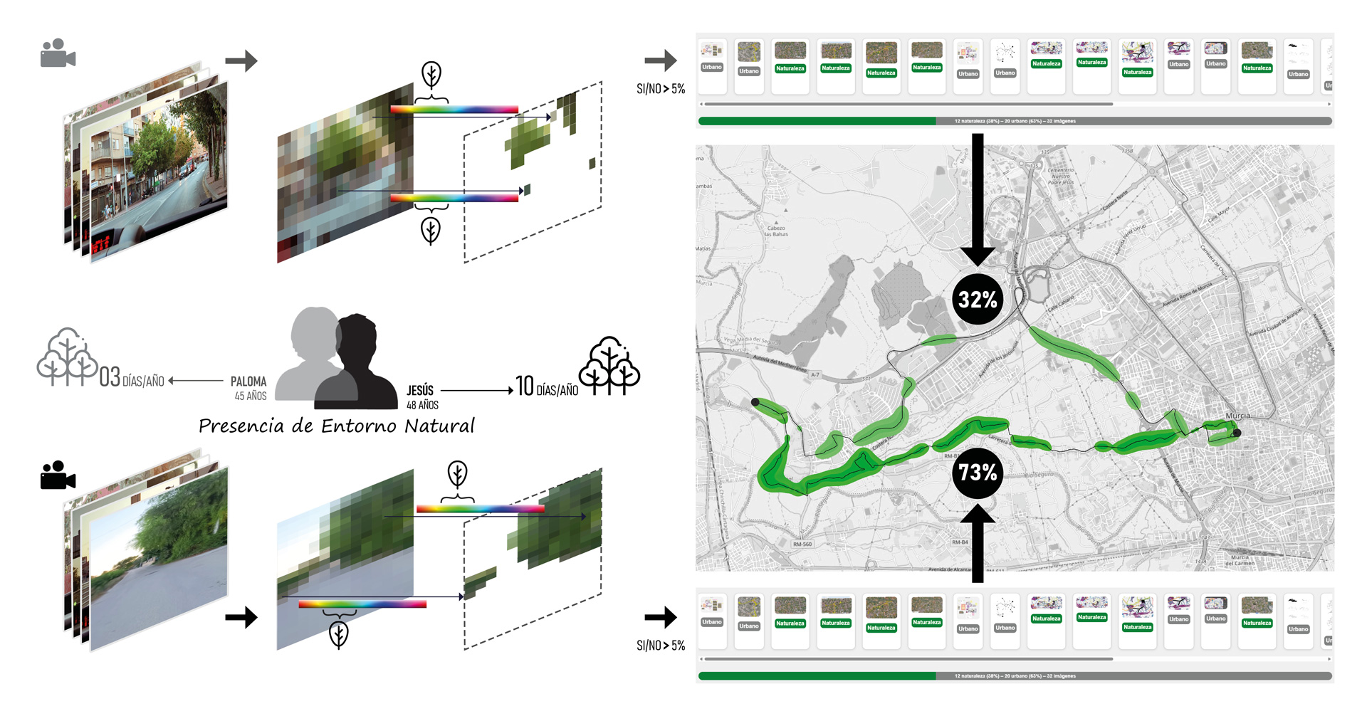 5.c – La presencia de entorno natural a lo largo del recorrido, medido a través de un aplicación que lo estima a partir de fotogramas de vídeo trasladado a un mapa y mostrando su equivalencia en días vividos en un bosque a lo largo de un año.